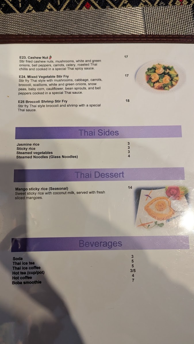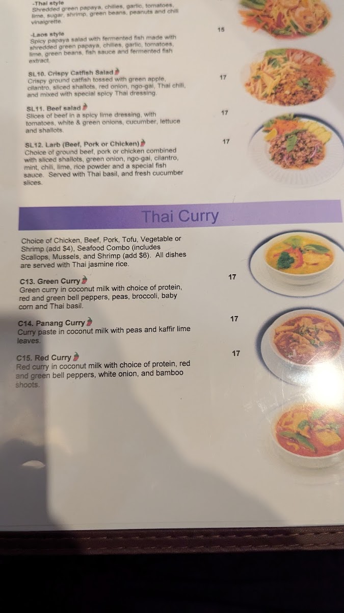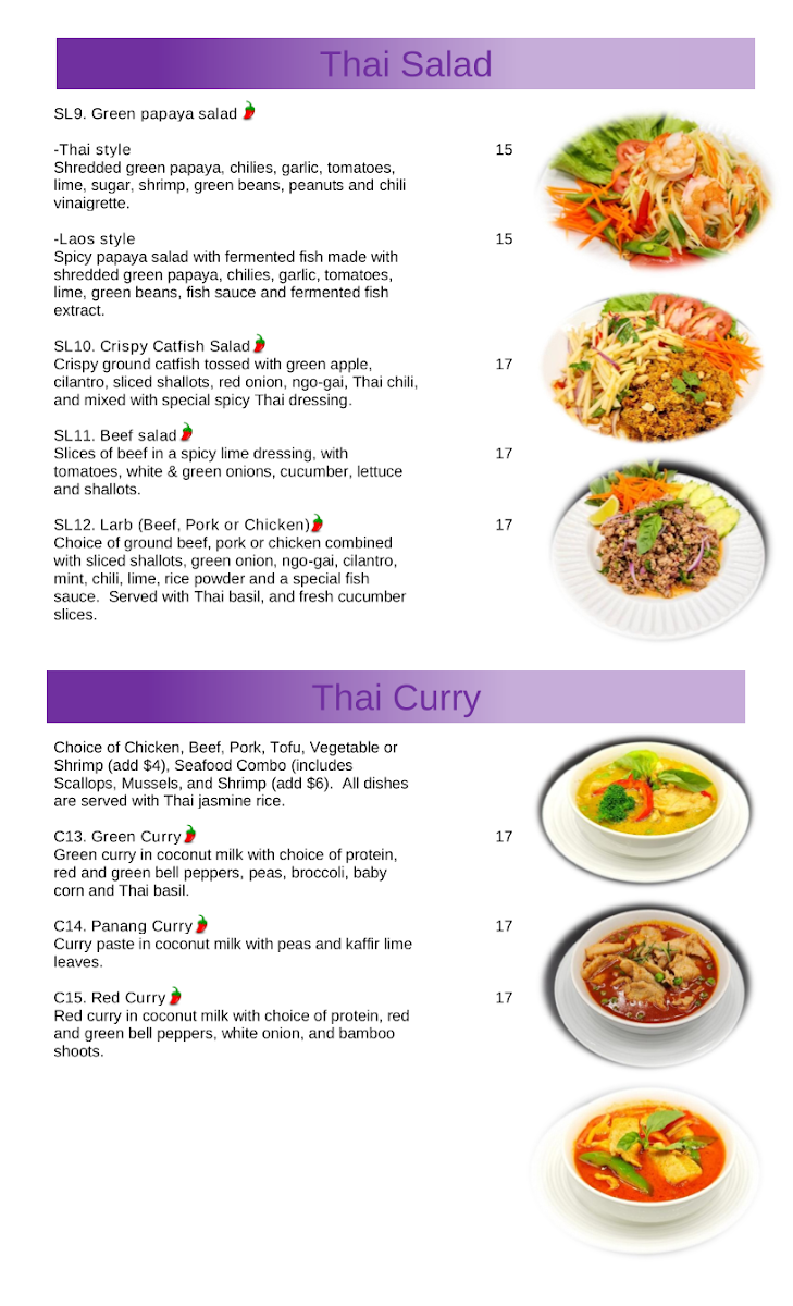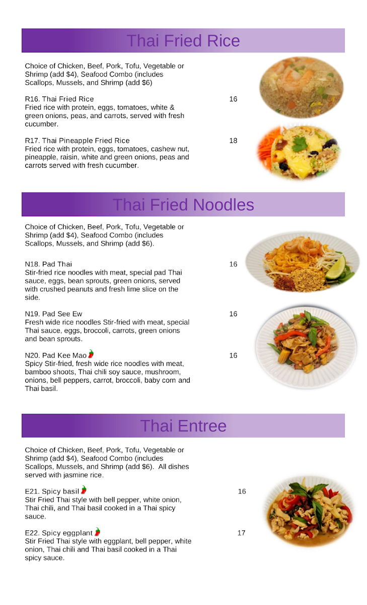 Choice of Chicken, Beef, Pork, Tofu, Vegetable or Shrimp (add $4), Seafood Combo (includes Scallops, Mussels, and Shrimp (add $6). All dishes are served with Thai jasmine rice.